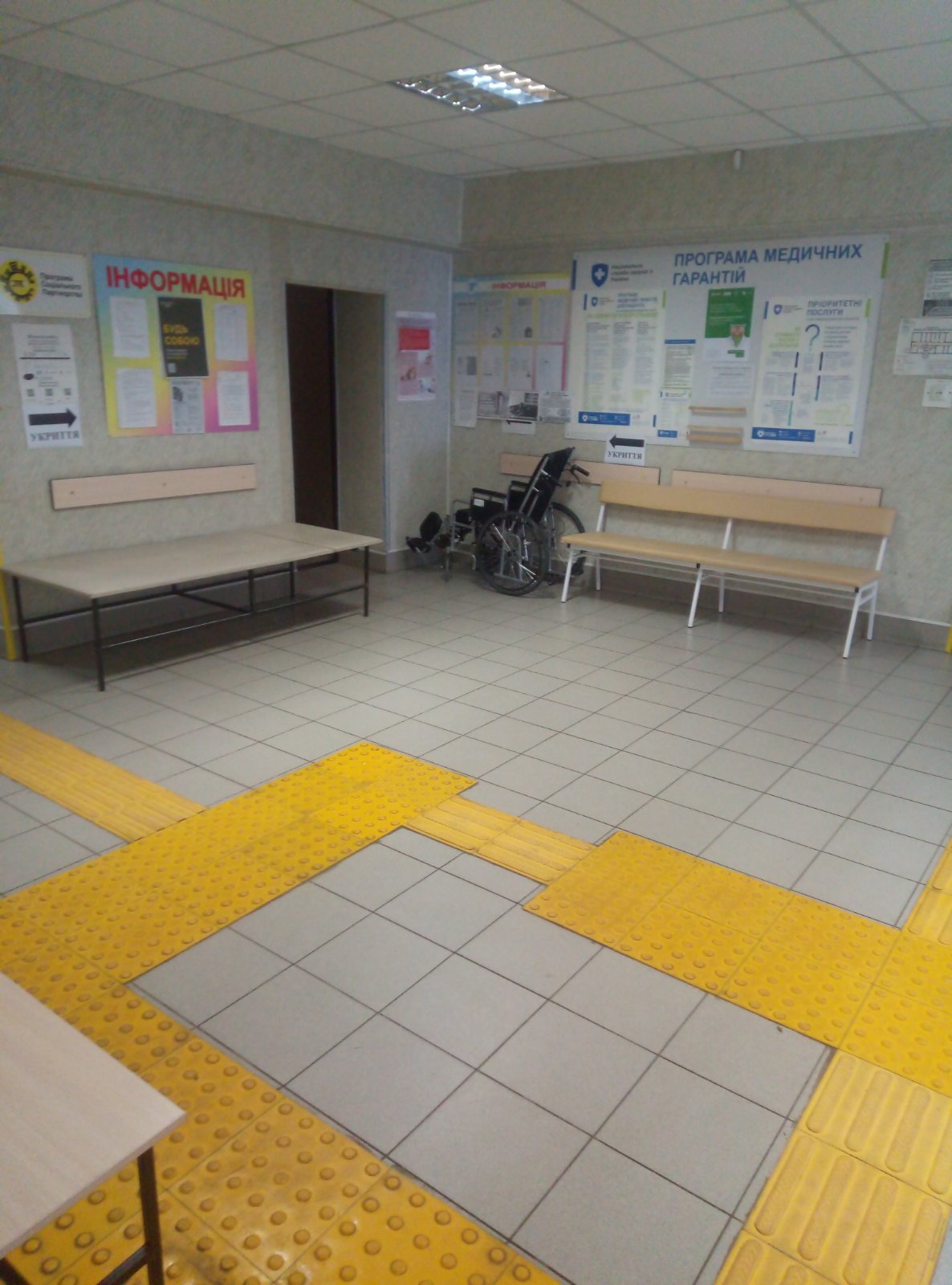Вхід, всі приміщення та проходи мають належне освітлення. Наявні лавки та кушетки для очікування. Наявні тактильні та контрастні орієнтирі для безпечного пересування людей з порушеннями зору та кращого запам’ятовування маршрутів (плитка тактильна напільна).