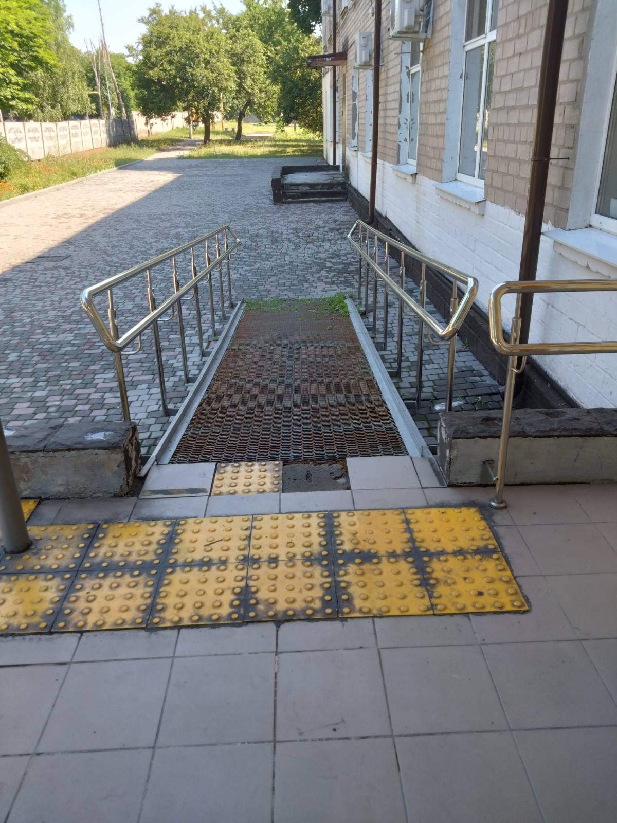 Вхід в будівлю КНП «ЦПСД м.Тернівки» ТМР має сходи, які продубльовані пандусом. Майданчик перед входом захищені від атмосферних опадів.
