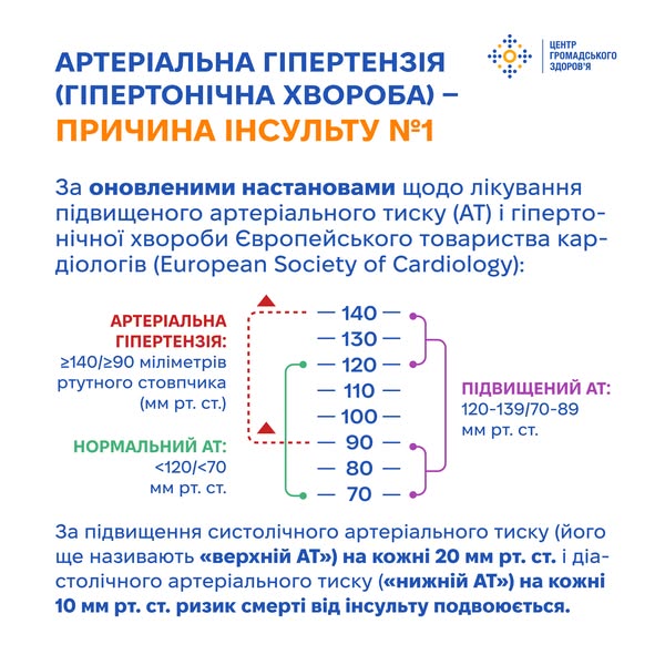 За підвищення систолічного АТ (який відображає тиск після скорочення серця; його ще називають «верхній АТ») на кожні 20 мм рт. ст. і діастолічного АТ (який показує тиск у судинах, коли серце відпочиває між ударами; «нижній АТ») на кожні 10 мм рт. ст. ризик смерті від інсульту подвоюється.