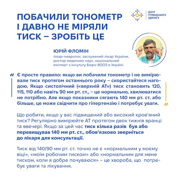 «Є просте правило: якщо ви побачили тонометр і не вимірювали тиск протягом останнього року — скористайтеся нагодою. Якщо систолічний («верхній АТ») тиск становить 120, 115, 110 або навіть 90 мм рт. ст., — це нормально, хвилюватися не потрібно. Але якщо показники сягають 140 мм рт. ст. або більше, це може свідчити про гіпертензію і потребує уваги».