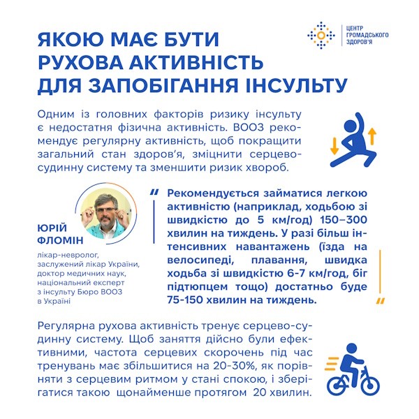 Одним із головних факторів ризику інсульту є недостатня фізична активність. ВООЗ рекомендує регулярну активність, щоб покращити загальний стан здоров’я, зміцнити серцево-судинну систему та зменшити ризик хвороб.